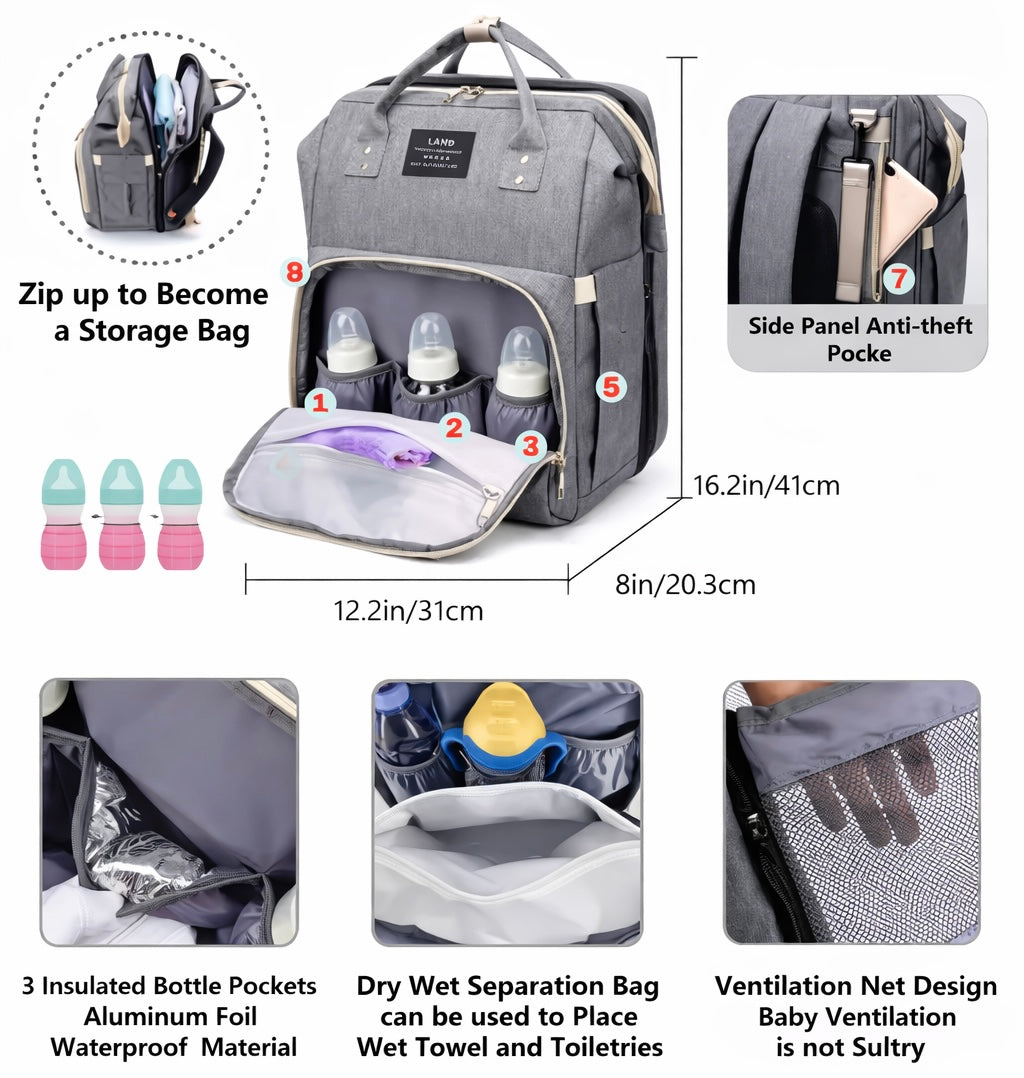 CradlePack™ is designed with both baby comfort and parent convenience in mind. It combines organized storage, hands-free carry, and baby-friendly features that support comfort on the go — all in one smart design.