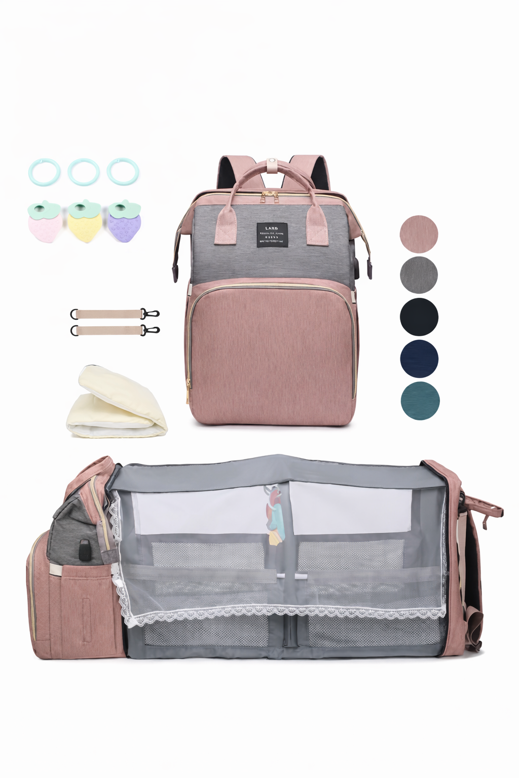 CradlePack™ offers spacious, well-organized storage for diapers, bottles, wipes, clothes, toys, and other baby essentials — keeping everything easily accessible.